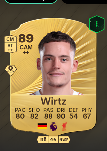 Florian Wirtz’s Gold Rare card shines as a Central Attacking Midfielder with an impressive overall rating of 89, making him a standout choice for any squad. Boasting exceptional dribbling at 90 and a top-tier passing rating of 88, Wirtz is perfectly equipped to orchestrate attacks and unlock stubborn defenses. His pace of 80 and shooting rating of 82 ensure he can surge forward and capitalize on scoring opportunities, while his technical finesse makes him a constant threat in the final third. Although his defensive and physical attributes are more modest, Wirtz’s creativity and sharp attacking instincts allow him to quickly break through opposition lines, setting up crucial chances and helping you seize control of the game when it matters most.
